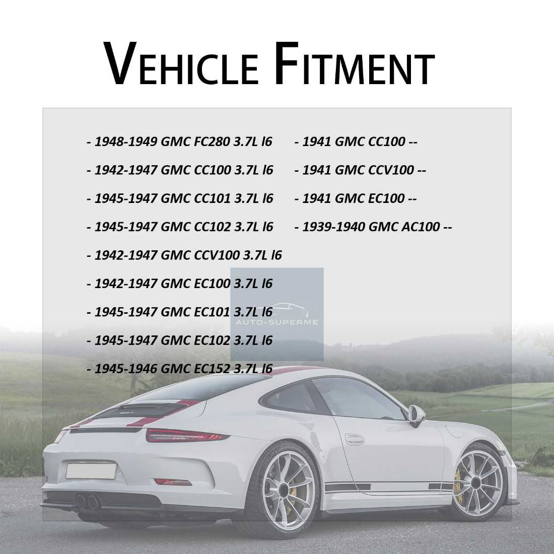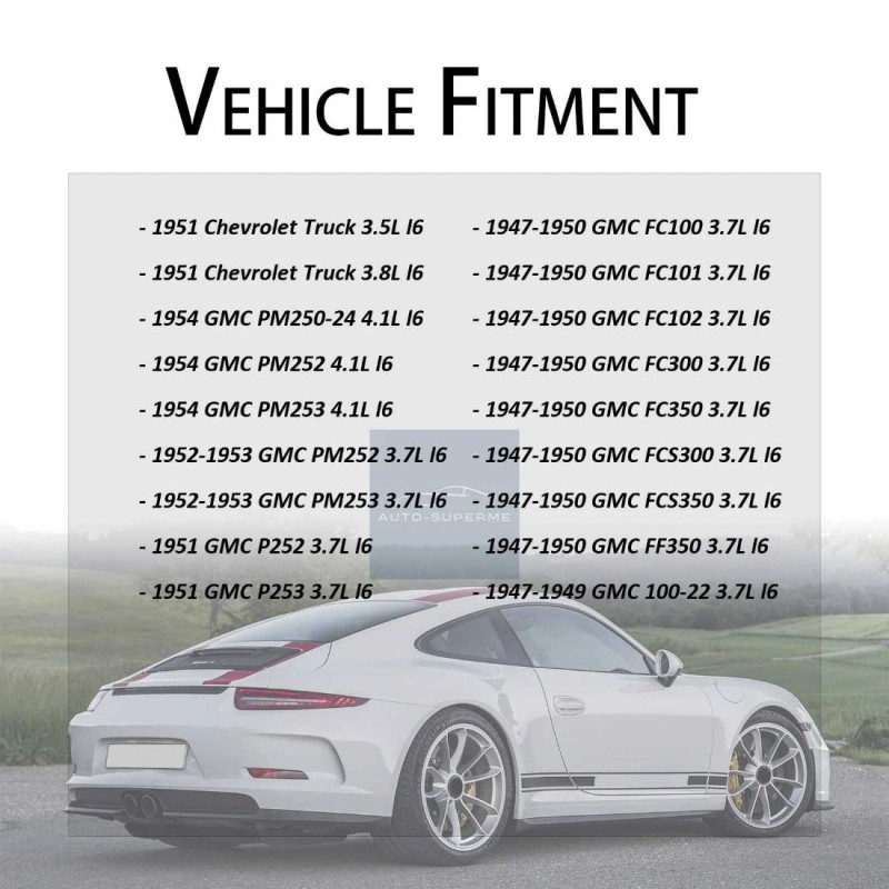 - OE/OEM Part Number: 1939 1940 GMC AC100 --, 1941 1942 1943 1944 1945 1946 1947 GMC CC100 -- 3.7L l6, 1941 1942 1943 1944 1945 1946 1947 GMC CCV100 -- 3.7L l6, 1941 1942 1943 1944 1945 1946 1947 GMC EC100 -- 3.7L l6, 1945 1946 1947 GMC CC101 3.7L l6, 1945 1946 1947 GMC CC102 3.7L l6, 1945 1946 1947 GMC EC101 3.7L l6, 1945 1946 1947 GMC EC102 3.7L l6, 1945 1946 GMC EC152 3.7L l6, 1947 1948 1949 GMC 100-22 3.7L l6, 1947 1948 1949 1950 GMC FC100 3.7L l6, 1947 1948 1949 1950 GMC FC101 3.7L l6, 1947 1948 1949 1950 GMC FC102 3.7L l6, 1947 1948 1949 1950 GMC FC300 3.7L l6, 1947 1948 1949 1950 GMC FC350 3.7L l6, 1947 1948 1949 1950 GMC FCS300 3.7L l6, 1947 1948 1949 1950 GMC FCS350 3.7L l6, 1947 1948 1949 1950 GMC FF350 3.7L l6, 1948 1949 GMC FC280 3.7L l6, 1951 Chevrolet Truck 3.5L 3.8L l6, 1954 GMC PM250-24 4.1L l6, 1951 GMC P252 3.7L l6, 1951 GMC P253 3.7L l6, 1952 1953 1954 GMC PM252 3.7L 4.1L l6, 1952 1953 1954 GMC PM253 3.7L 4.1L l6
