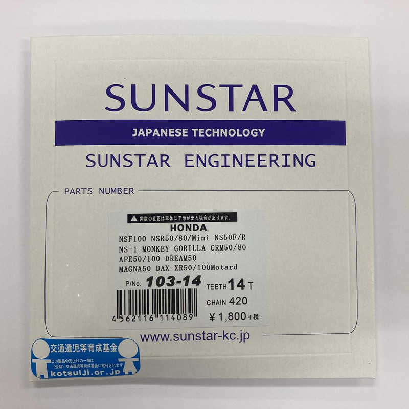Sunstar 420-14T Front Sprocket 103-14T APE50, 100, XR50M, 100M, NSR50/80/NS-1/MONKEY, etc
