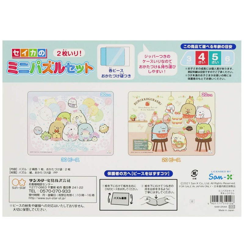 - Mini puzzle half the size of a traditional B4 puzzle Includes 20 pieces and 30 pieces. Sumikko Gurashi Design