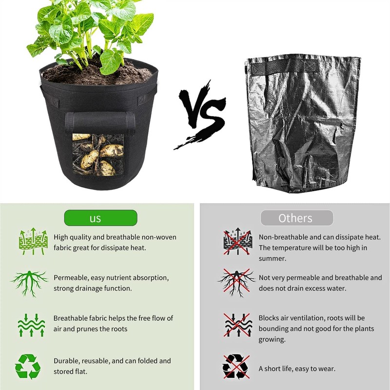 - 【Wide Applications】Perfect for patios, balconies, sun rooms, small gardens and any indoor/outdoor space. Grow bags can be used to potato, onions, taro, carrots, garlic, radish, nursery, garden flower, some organic and other vegetables. It also be used as storage bag, such as put the dirty clothes, pack the tools ect.