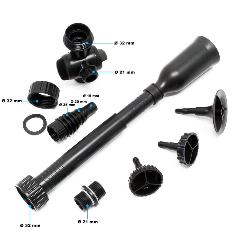 • [Package Contents] - The attachment set consists of 3 different easy to change fountain nozzles, the telescopic tube and the connector including Y-adapter with flow control. Adjust the water flow for the fountain infinitely or optimise the inflow to the UVC clarifier/filter unit.