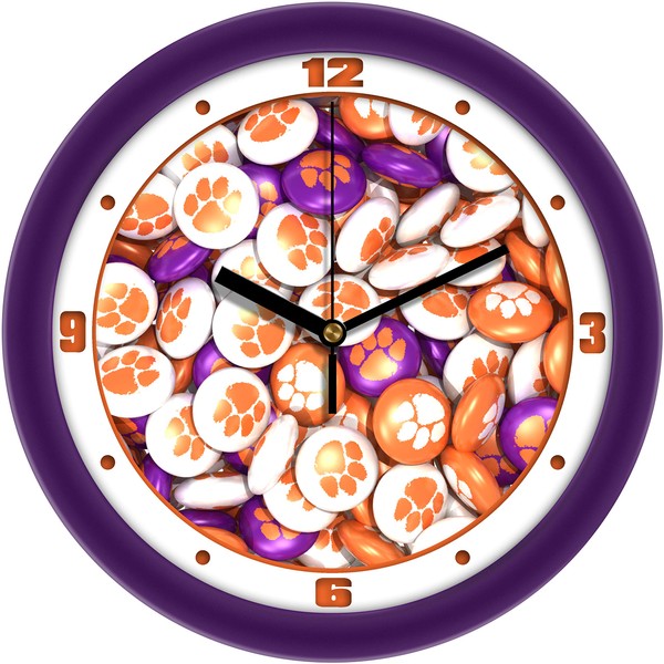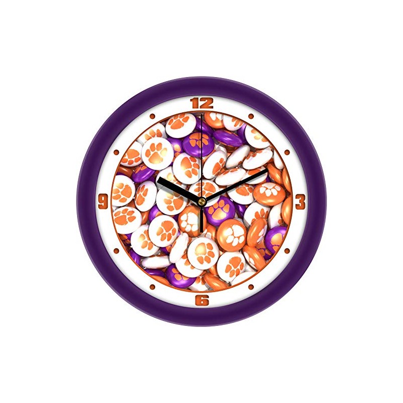 Demonstrate your team spirit in your home or office with your favorite college logo. These 11.5 inch Candy Wall Clock feature a battery-powered (1xAA battery included) quartz accurate movement. Unlike plastic wall clocks, you experience superior visibility with our mineral glass crystal. The printed ring on the crystal displays the numbers with a school color-coordinated outer bezel. Clock Measures: 11.5" x 11.5"