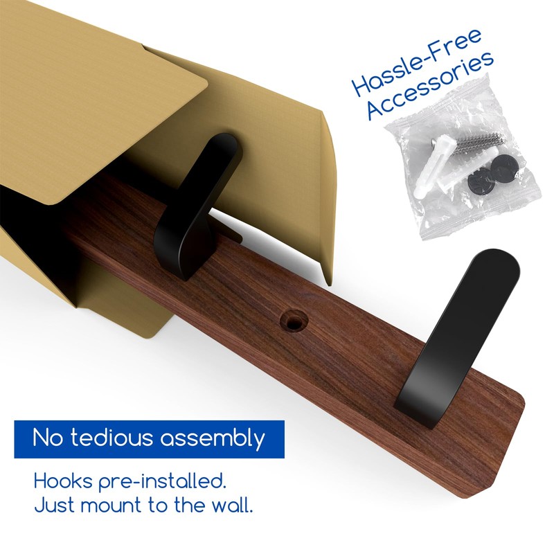 • Stylish Minimalist: A rustic walnut wood base paired with sleek black metal hooks blends seamlessly with any décor. Matching screw covers keep the appearance clean and uniform, adding a touch of modern minimalism to your space