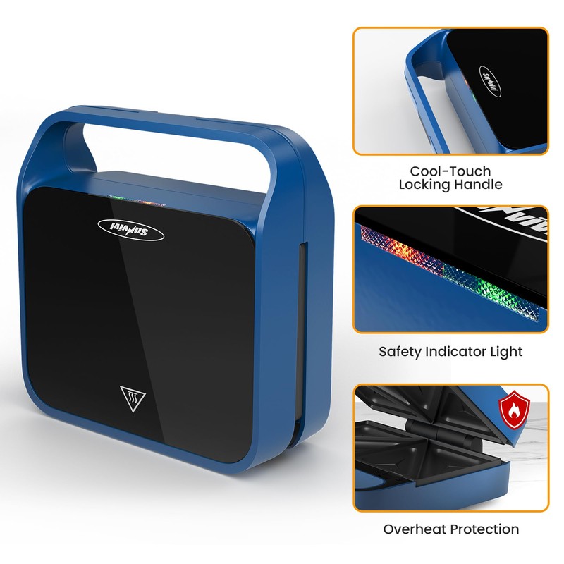 - Smart Features: The sandwich maker comes with red and green indicator lights. The smart temperature control prevents overheating. The cool-touch handle ensures safety when cooking and removing the grill plates.