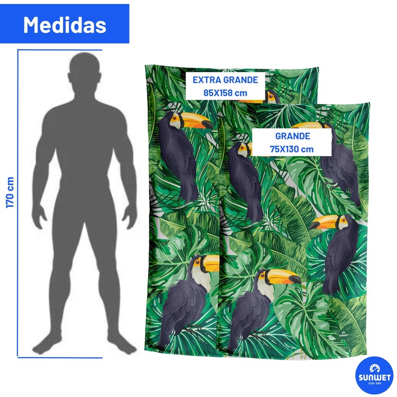 SUNWET STAY DRY | Toalla Microfibra Tucanes Extra Grande (158x85cm) | Toalla Secado Rapido Compacta y Ligera | Ideal para Viajes Deportes y Playa | Toalla para Gym Resistentes y Duraderas
