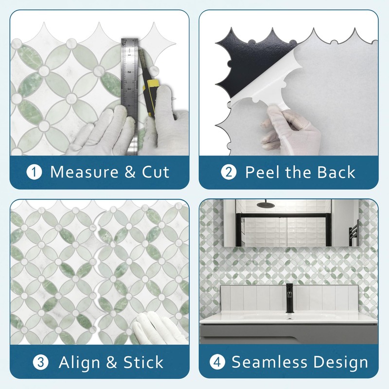 • Easy Installation: Our product is designed to be incredibly easy to install. Simply peel off the back protective film and stick it onto the desired surface. For best results, we recommend using sturdy scissors or a utility knife to ensure precise cutting. If you prefer, a jig saw or split saw can also be used. Please exercise caution when handling tools. Once the tiles are securely in place, you can enhance the overall appearance by applying grout for a flawless finish.
