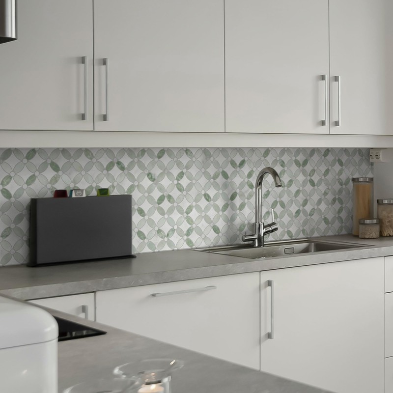 Waterjet Coin White Stripped and Tiled is an exquisite masterpiece meticulously crafted to elevate your project and imbue it with a touch of opulence. This stunning combination of colors and textures creates a truly unique and captivating aesthetic. The intricate Coin pattern in white marble, adorned with subtle gray textures, effortlessly complements any color palette while adding a subtle charm to your space.These waterjet tiles seamlessly interlock, forming a continuous pattern, ensuring a hassle-free and swift installation process. The remarkable durability of these materials makes them suitable for both residential and commercial wall installations. This modern classic, with its peel and stick feature, has become a popular choice for various applications such as kitchen design, functional walls, and bathroom backsplashes.
