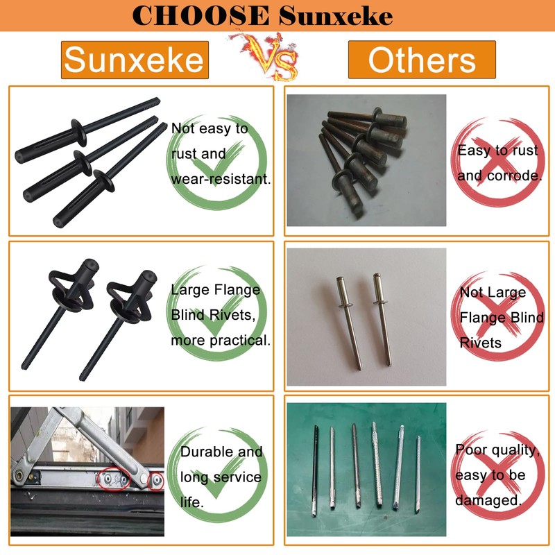 - Application: Rivets are suitable for indoor and outdoor use, such as connecting plastic, rubber, wood, handles and laminates. They are widely used in assembling RV, trailer, furniture and plastic frame windows