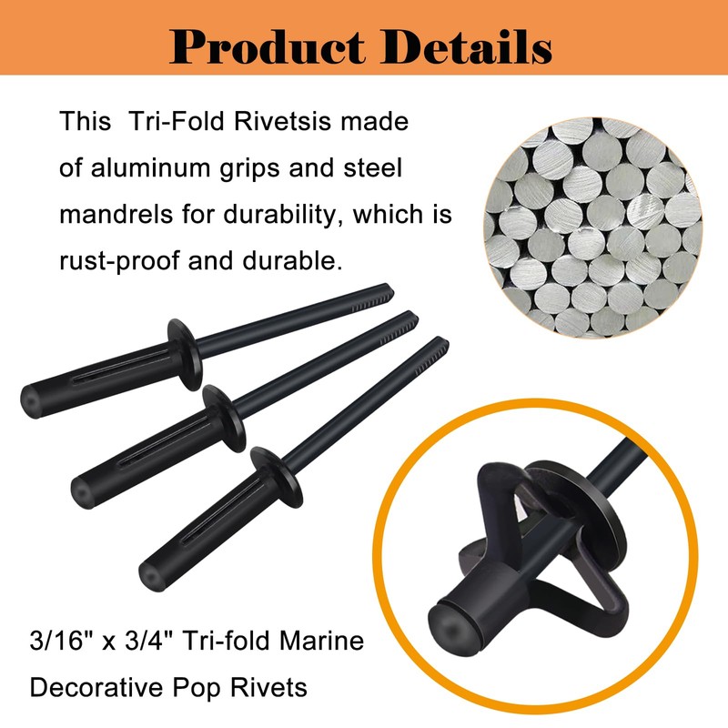 - Sunxeke 60pcs Tri-Fold Rivets ,3/16inch x 3/4inch, hole size 3/16inch, Length:3/4inch (20 mm),Black Tri-fold Marine Decorative Pop Rivets, Grip range:1/25inch - 1/4 inch (1mm-4mm)