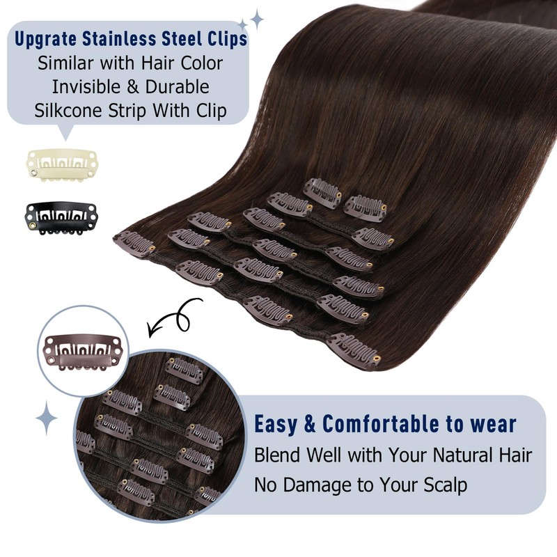 - Real hair extensions clip quality: silky hair extensions with silicone-coated clips that are strong enough to fix the position firmly and securely. Machine made strong hair wefts prevent hair from shedding. Salon quality hair extensions with clips. Invisible and seamless to wear. Real Remy human hair extensions last 2-3 months with proper care.