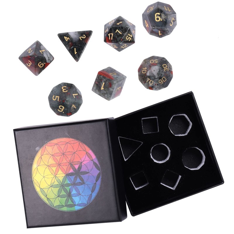 - Stone Polyhedral Dice: The dice corners are all made of the crystal stone for more comfortable rolling hand feel. Since the dices are all made of crystal stone, it will be varies in different colors and veins from lot to lot, the set(s) you receive will be have slightly different from our picture shown and will be the most unique.