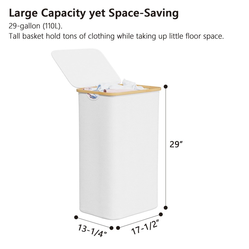 - Large Capacity yet Space-Saving: Measures 17-1/2” x 13-1/4” x 29”, 29-gallon (110L) capacity. Tall basket hold tons of clothing while taking up little floor space. Bamboo matching cloth design is a perfect addon to your bedroom, laundry room, bathroom, college dorm, or kid room's decor.