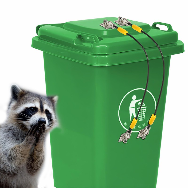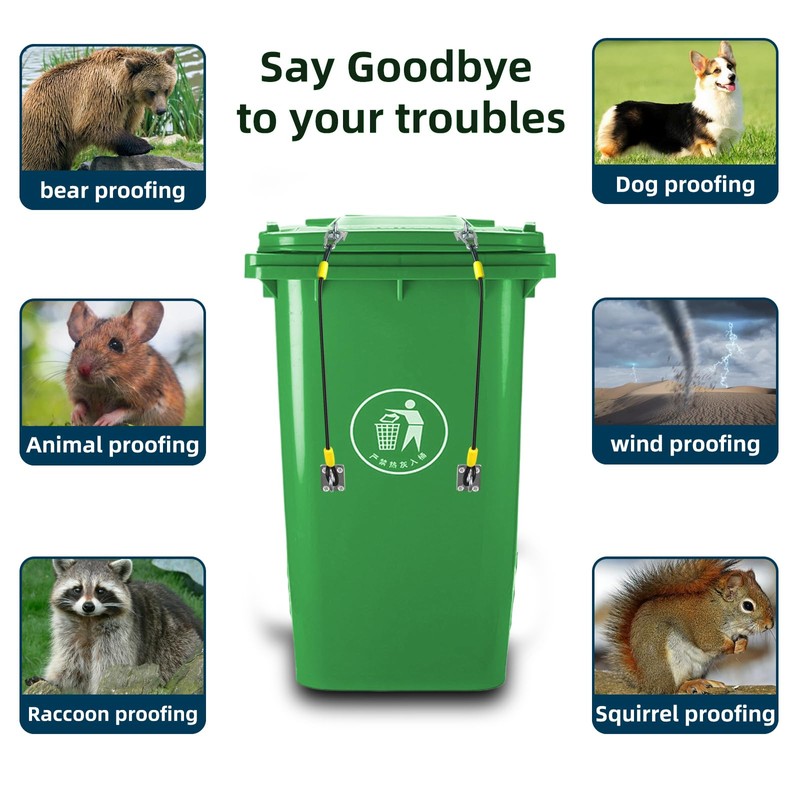 ·Our raccoon bear proof trash can Lid Locks are made of heavy-duty wire rope with a tensile strength of 160 kg to 170 kg, which prevents damage by wildlife and can be reused to keep the environment clean.