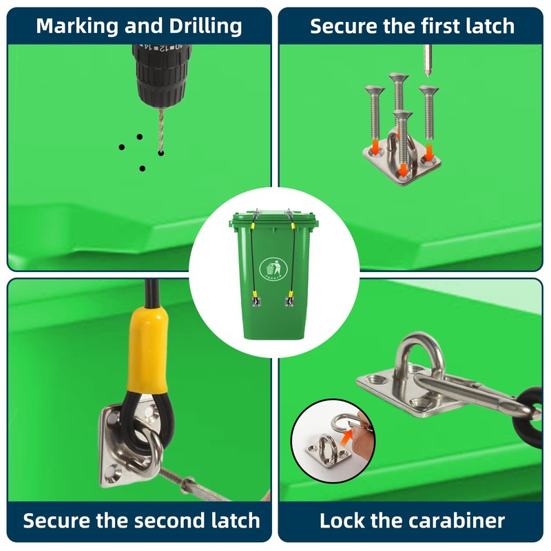 - Package Content:This trash can lock includes 2 wire rope, 4 stainless steel fixed heavy duty locks , 2 Snap Carabiners, 16 Long Screws, 16 Flange Nuts
