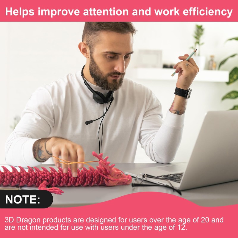 • 3D dragon is a fun stress relieving toy for manic fun, helps to improve concentration and work efficiency, suitable for adults to play. Our 3D Dragon products are designed for users over the age of 20 and are not intended for use with users under the age of 12.