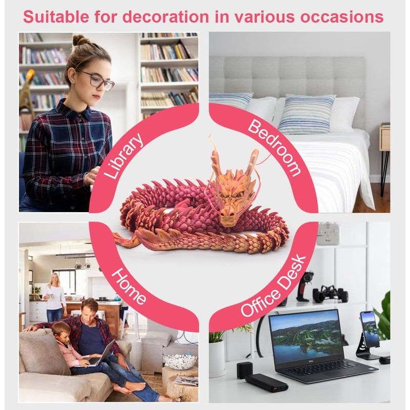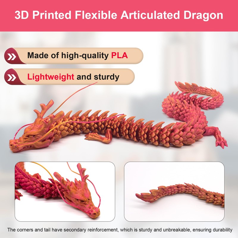 Type: 3D Printed Dragon Color: Red Material: PLA Size:24 inch Includes: 1 Pack 3D Printed Dragon 3D Printed Dragon is a fun stress relieving toy for manic fun, helps to improve concentration and work efficiency.dragon toy can be used as decorations for restaurants, libraries, art galleries, offices, bedrooms, homes, desks and other occasions, and are the perfect decorations for any fantasy collector fan.