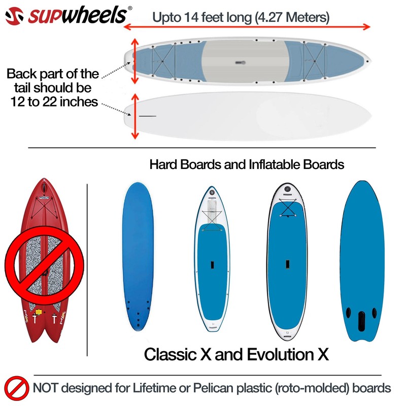 Arch is flexible and can adjust around your boards tail. It will widen out and flatten around your inflatable board. The space inside the frame is larger than the Evolution and has ability to stretch wider. The arch strap is flexible and can push against wheel spacer to make a wider space from standard 16 inches to 22 inches. Only part of the tail needs to fit in the arch frame.