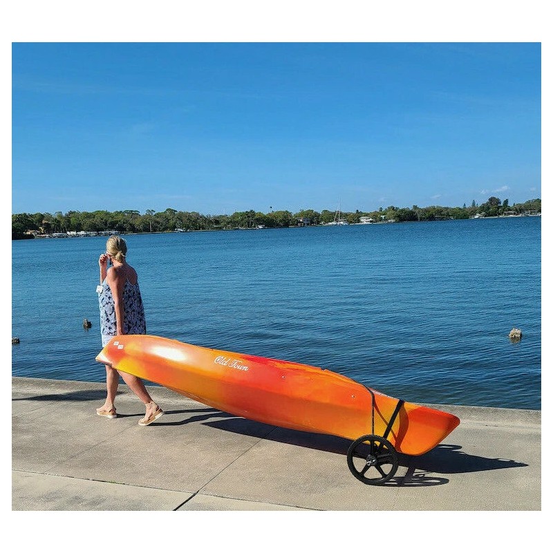 Lift the other end with your kayak handle and start walking. A lot of the weight is transferred to the wheels and take the load off of you.