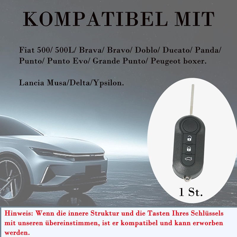 - Compatible with standard models: Suitable for models Fait: Fiat 500 / 500L / Brava / Bravo / Doblo / Ducato / Panda / Punto / Punto Evo / Grande Punto / Peugeot boxer. Lancia Musa/Delta/Ypsilon Ideal for: replacing worn shells, creating fuses. If the structure of your current key matches this available case, the solution is there.