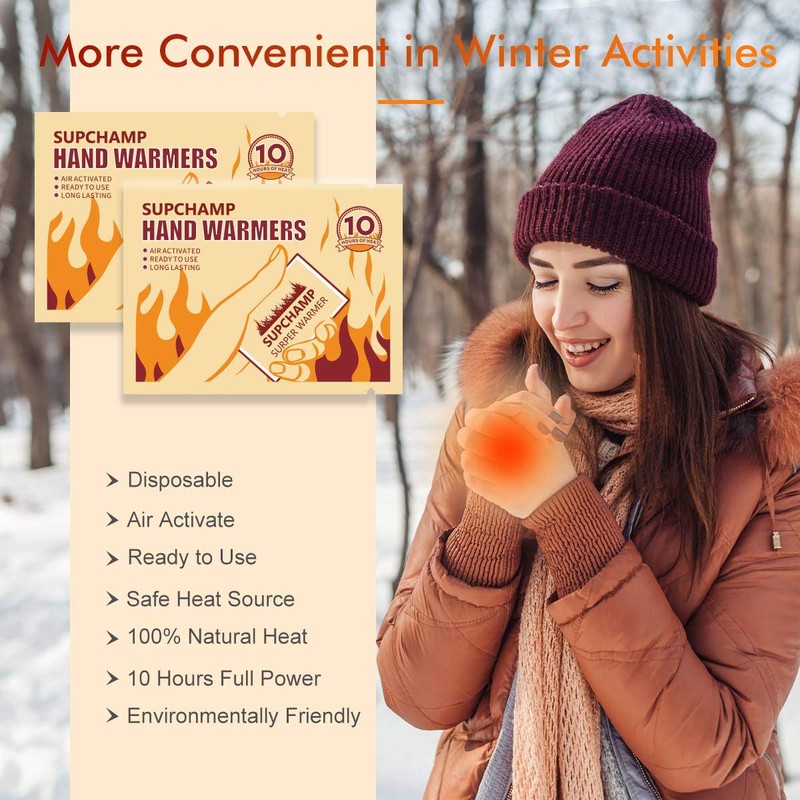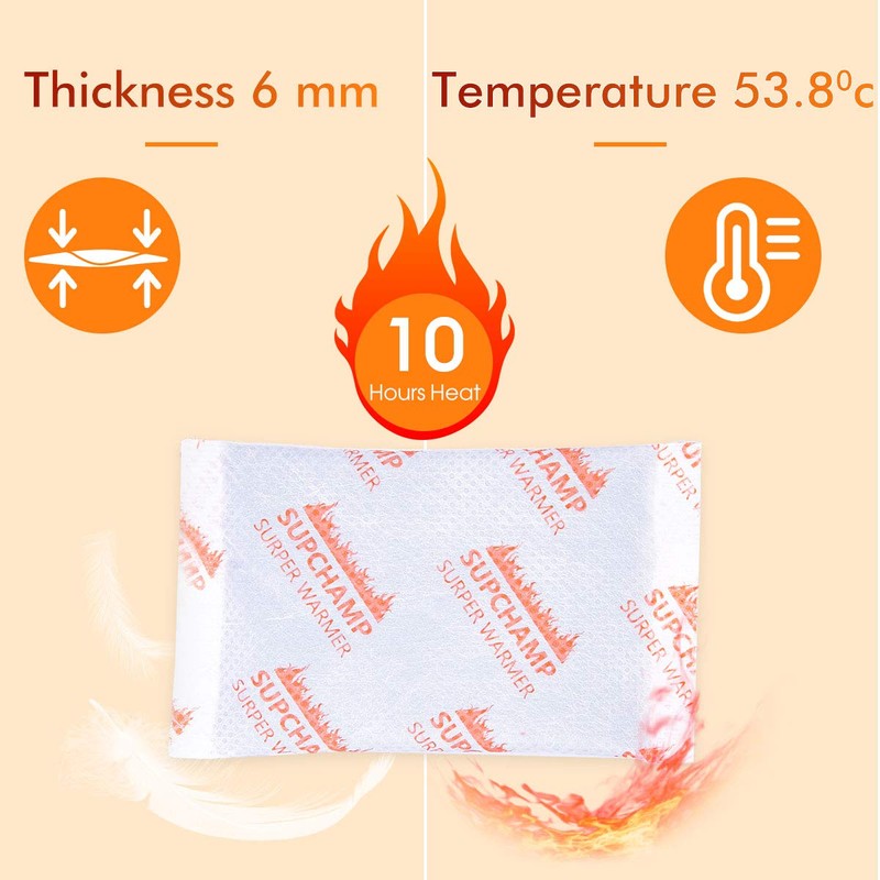 Box of 10 Packs of Supchamp Hand Warmers, One pack per package! Conveniently store them in your car, backpack, luggage or coat pockets. Simply open the packet, place the warmer in the pocket or gloves, it will stay warm for more than 10 hours.