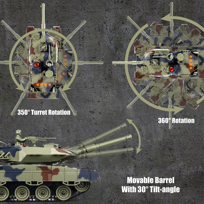 - 【Realistic Sounds & Smoke Features】The rc military tank with realistic sound and smoke features, and different engine sounds of machine gun, cannon and missile making the feeling more realistic. Sound can be turned off. When shooting, firing cannon or launching missile, tank will have recoil with remote vibration. Meanwhile, if your tank got hit, it will have a siren and go off.