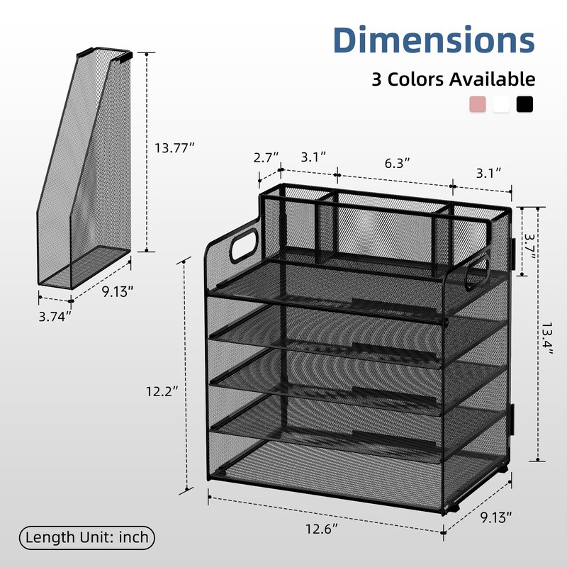 - Multifunctional & Space-saving: SUPEASY black desk organizers are designed with 5 paper trays, 3 pen holders and 1 magazine file holder for office organization and storage. The sliding letter tray is perfect for storing papers, letters, files, mails, etc. The Pen holders on the top is suitable for pencils, binder clips and small notebooks. Meanwhile, your big folders, magazines and books can be organized well in the side folder holder.