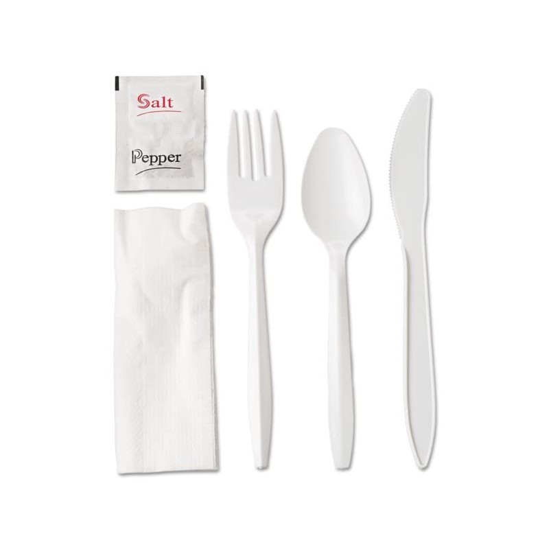 - FULL SET! - This set includes a knife, fork, spoon, napkin and salt and pepper packets so you can provide your guests with everything they need to enjoy their meal! Great for quick grab-and-go applications, this wrapped cutlery pack is a cleaner alternative to unwrapped plasticware. Plus, since it's all disposable, you won't have to worry about collecting and cleaning silverware at the end of meal service.