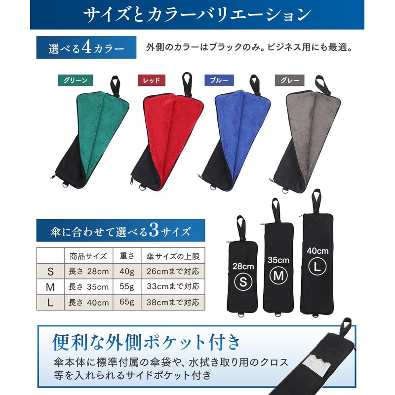- This umbrella cover is available in sizes 11.0, 13.0, 15.0 inches (28, 33, and 38 cm). The microfiber fill makes it double the length of our past so that it can absorb the water from the umbrella. The handle can fit all the way into the size of the umbrella, so there is no need to worry about water dripping