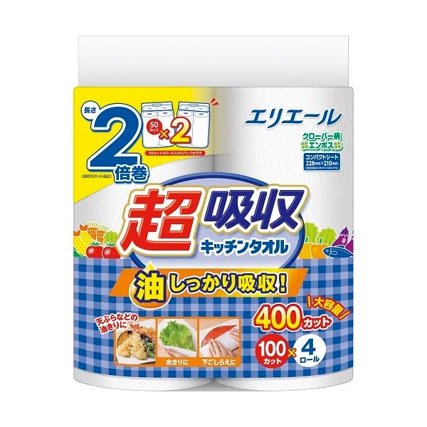 エリエール Super Absorbent Kitchen Towels, 100 Cuts x 4 Rolls