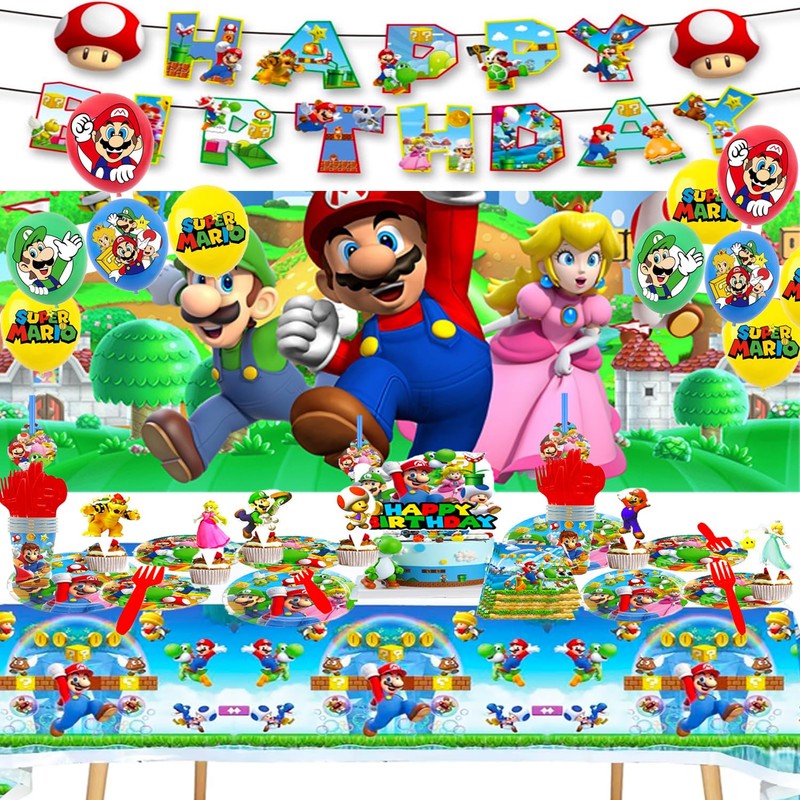 - 【Super Bros Party Decorations Set 】A Decorations Set includes 20 9" plates, 20 7" plates, 20 Napkins, 20 Fork,1 Banners,1 Tablecloth,16 Balloon,1 Large Cake Card,24 small cake Card.B Decorations Set includes 20 9" plates, 20 7" plates, 20 Napkins, 20 Fork,1 Banners,2 Tablecloth.