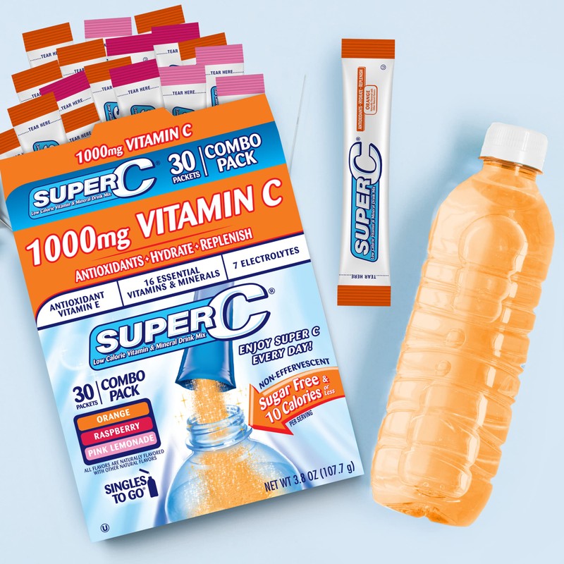 • CONVENIENT C Packaged in perfectly portioned drink mix sticks, it's easy and convenient to enhance your water with Super C. Simply add one stick to a 16.9 oz. bottle or glass of water, shake/stir, and enjoy. Add to 20 oz. of water for a milder flavor