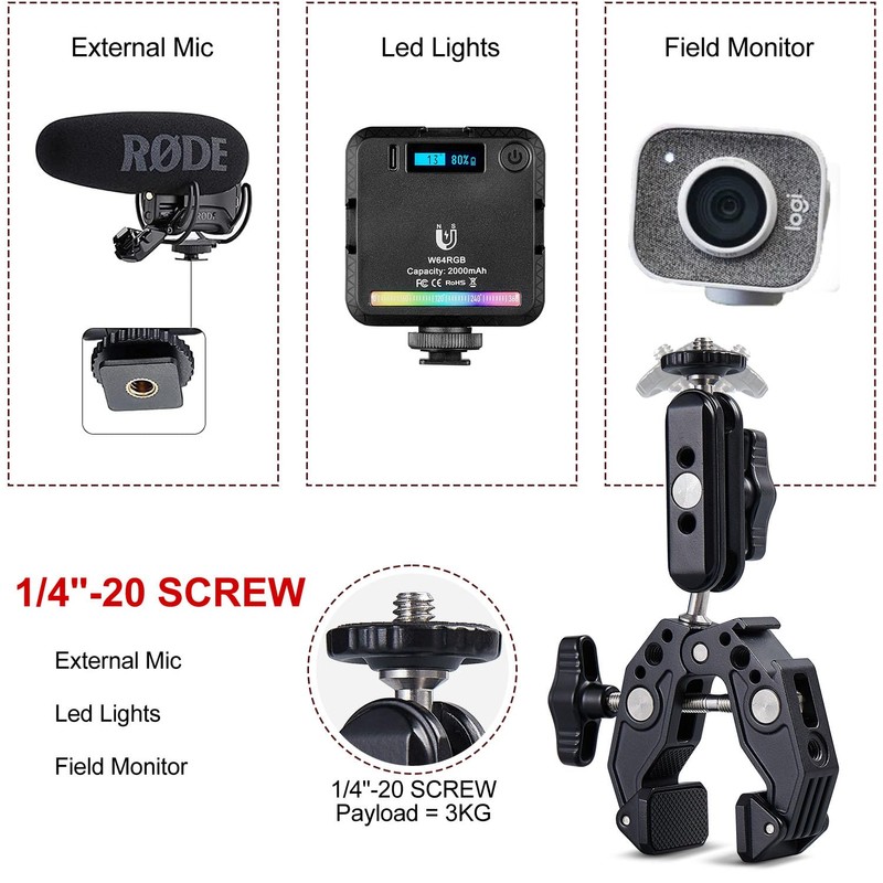 - 【Adjustable Jaw Opening】 Super clamps fit flat and round objects 0.6" to 2.2" (14mm to 55mm) in diameter.Best loading weight is 1.5kg/3.3lb. After mounting, make sure test the stability before shooting.Use the screw knobs to loosen and tighten the clamps with ease.