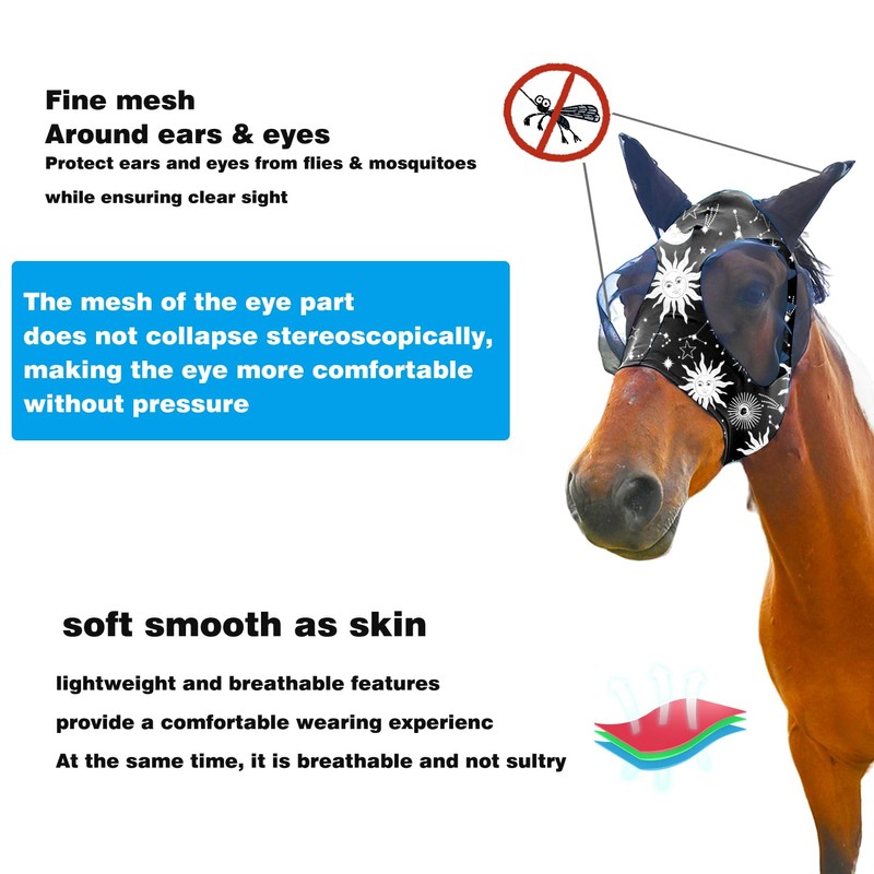 • EASY TO WEAR: Introducing our practical Horse Fly Mask with Ears, providing exceptional comfort and protection for your horse. This unique mask offers excellent stretchability, ensuring a secure fit without discomfort. Shield your horse from flies with our high-quality, stylish design. Invest in our Horse Fly Mask with Ears for your horse's well-being. Character