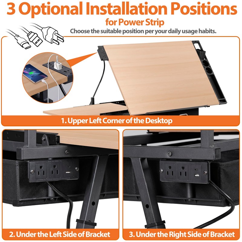 • Built-in Outlets for Convenient Power Access -- A power outlet is provided on one side of the desk - it can be installed on the left or right side as you like, allowing for easy connection to power sources or other electronic devices without worrying about tangled wires. This design allows creators to focus more on their work during the painting process, improving work efficiency.