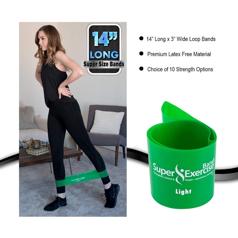 Super Exercise Band 10 Pack 14" x 3" Extra Long Green Light Strength Mini Loop Bands. Non-Latex Resistance for Fitness, Physical Therapy, Pilates, and Strength Training.