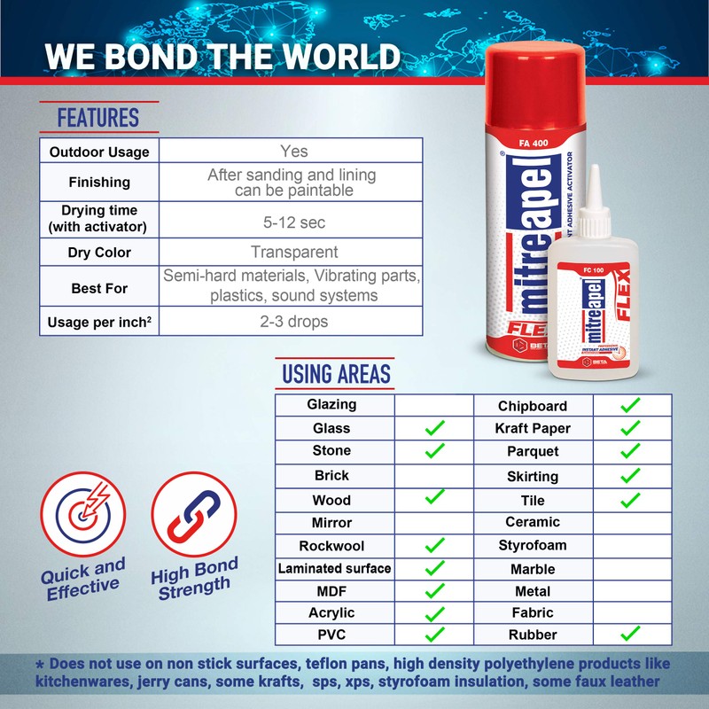 - Compatible With Multiple Materials - This cyanoacrylate accelerator is suitable for use on a variety of materials, vinyl and shoe repair glue, from wood to glass & stone to metal. Avoid using the cyanoacrylate glue on nonstick surfaces and polyethylene products.