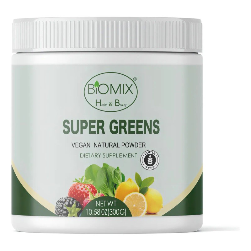 - El suplemento Super Greens de Biomix Health & Beauty es un polvo concentrado que combina más de 40 superfoods cuidadosamente seleccionados. Está diseñado para promover un estilo de vida saludable, mejorando el metabolismo, desintoxicando el organismo de forma natural y fortaleciendo el sistema inmunológico. Este producto es totalmente natural, vegano, sin gluten y sin azúcares añadidos, ideal para quienes buscan mejorar su bienestar integral. Características Principales: +40 Superfoods: Incluye una amplia gama de ingredientes ricos en nutrientes para proporcionar beneficios multifuncionales. Fibras y Probióticos: Ayudan a la salud digestiva y favorecen una flora intestinal equilibrada. Antioxidantes: Protegen al cuerpo del daño oxidativo. Bajo en Calorías: Contribuye al mantenimiento del peso saludable. Sensación de Saciedad: Ideal para controlar el apetito entre comidas. Contenido del Producto: Tamaño del bote: 300 gramos. Porciones: Rinde hasta 60 porciones. Dosis diaria recomendada: Tomar 5 gramos al día mezclados con agua o la bebida de su preferencia. Beneficios Clave: Mejora el metabolismo: Con ingredientes que ayudan al metabolismo celular y aumentan la energía. Desintoxicación natural: Componentes como la chlorella y el jengibre ayudan a eliminar toxinas. Refuerza el sistema inmunológico: Con ingredientes como el extracto de baya de saúco y la espirulina, conocidos por sus propiedades inmunoestimulantes. Propiedades antiinflamatorias: Ayuda a reducir la inflamación en el cuerpo. Energía natural: Ingredientes como el té verde matcha proporcionan un impulso energético sin los picos de cafeína. Soporte cerebral y cardíaco: Con ingredientes como el extracto de semilla de uva y el ginseng americano que contribuyen al bienestar del cerebro y el corazón. Ingredientes Completo: Fibra de raíz de achicoria (fructo
