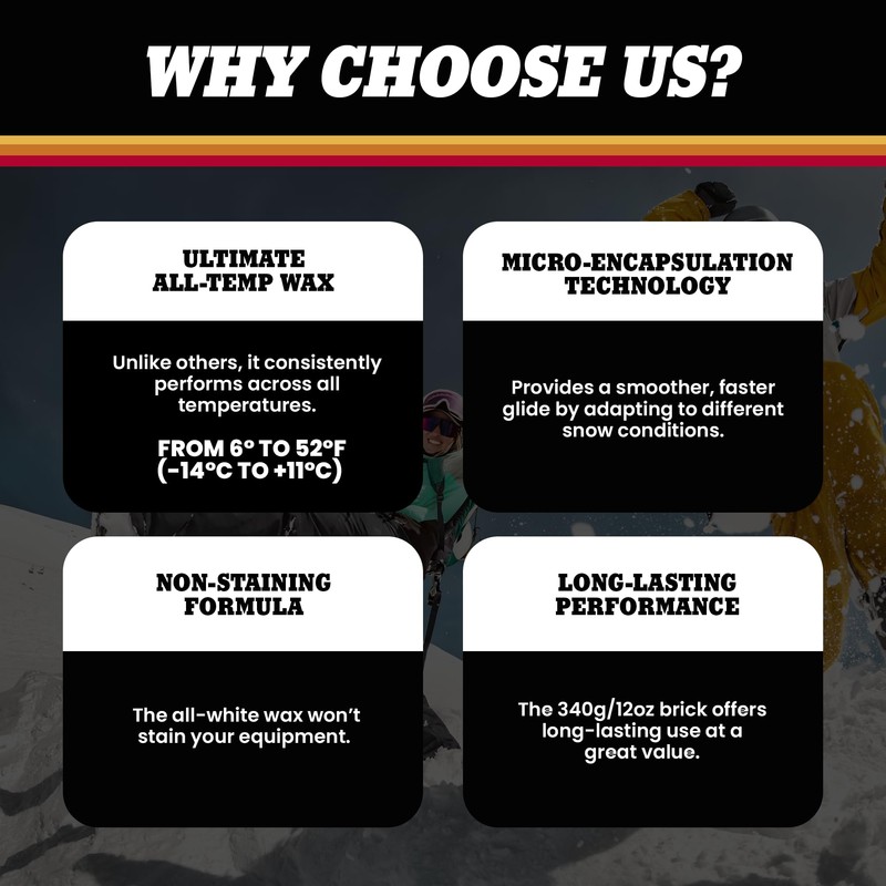 - MORE CONTROL – LESS FATIGUE-Our all temperature wax is specially formulated to work in all snow and weather conditions and great for riders of all levels. Stop using the colored snowboard wax formulas that are dangerous and don’t give you the speed and control you’re looking for