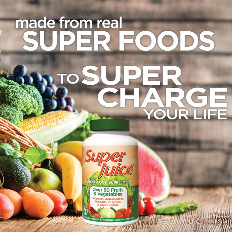 - MADE FROM REAL WHOLE FOODS. Super Juice is crafted from a diverse blend of whole foods, including vegetables, fruits, berries, grasses, kale, and alfalfa. These ingredients work synergistically to promote healthy bones, boost energy levels, and enhance your immune system.