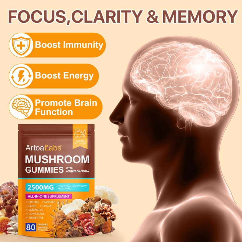 - 【High Potency Formula Supplement】Each serving of our Mushroom with Ashwagandha gummies is packed with 2500mg of functional mushroom extracts, ensuring you get the maximum benefits. With an impressive absorption rate, let your body highly and efficiently absorbs the nutrients, making this mushroom blend supplement an ideal choice for those seeking noticeable results
