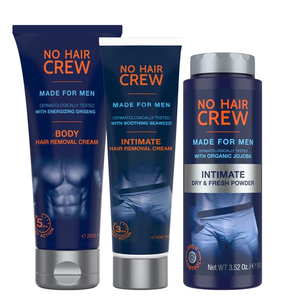 Super Pack NO HAIR CREW – Lote de 2 cremas y 1 Polvo- una Crema Depilatoria Íntima Premium - Bote de 100 ml + una Crema Depilatoria Corporal Masculina - Bote de 200 ml + un Polvo Íntimo Premium DRY & FRESH | Bote de 100 g
