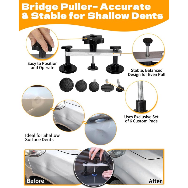 - All-in-One Dent Puller Kit: Includes slide hammer, T-bar, bridge puller, dent lifter, glue gun, glue sticks, and multiple tabs—everything you need for paintless dent removal at home or on the go.