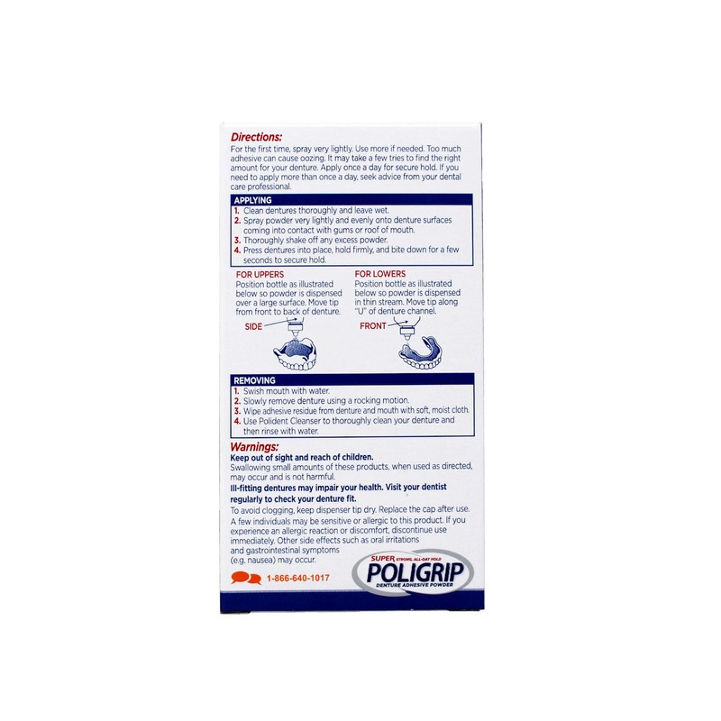 Product DescriptionSuper Poligrip Powder provides strong hold in a convenient powder form.Manufacturer Contact Information1-866-844-2796