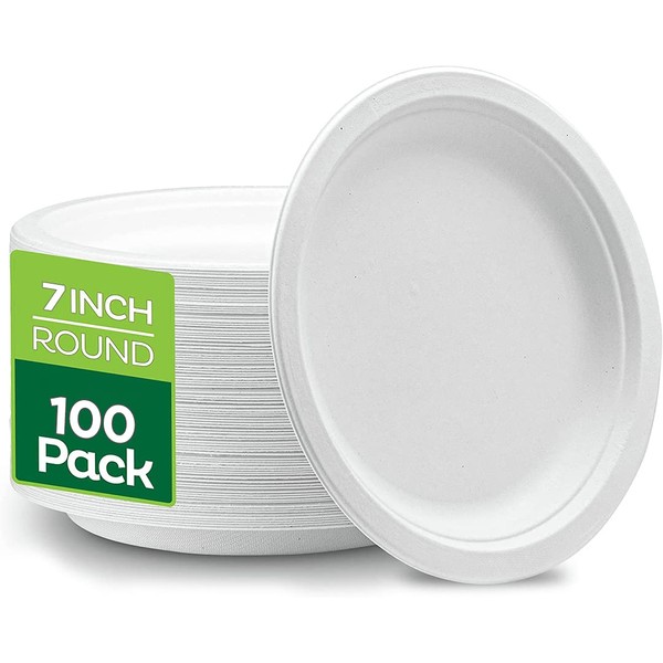 Super Rigid Disposable Plates (7 Inches) (Pack of 100) 100% Biodegradable, White Bagasse Paper Plates, Made of Sugarcane Fibers - Perfect for Picnics Parties