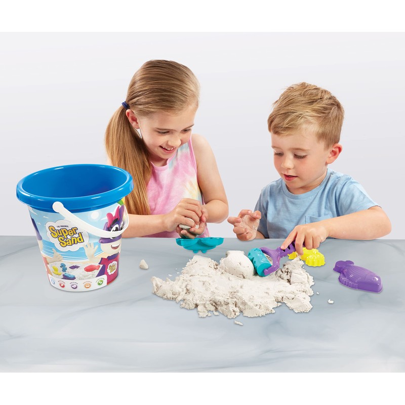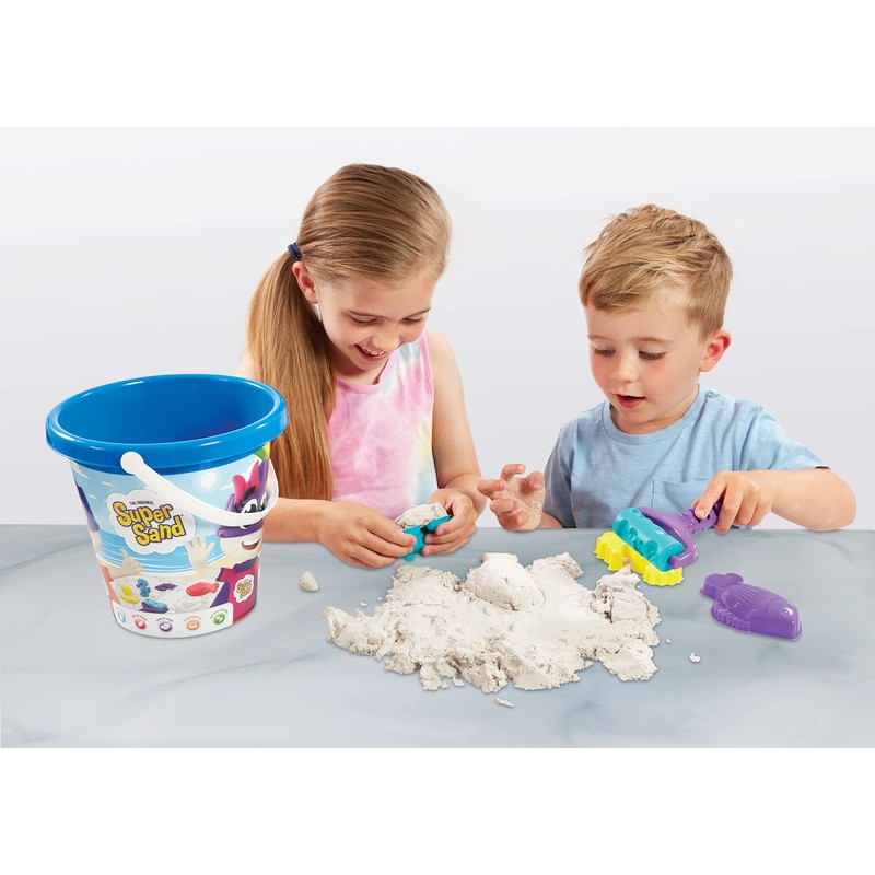 - Includes 600g white sand, 3 molds and storage bucket