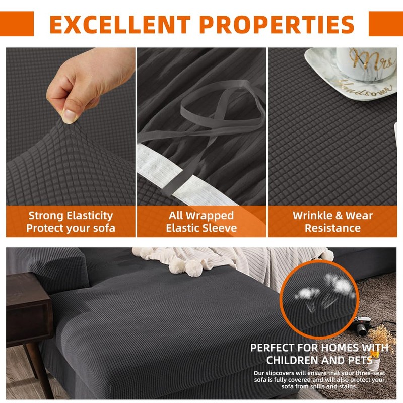 • High-Quality Fabric: Crafted from a durable blend of 50% spandex and 50% polyester, our stretchable sofa cover offers a snug fit for your 3-seat sofa. Not only does it shield your sofa from spills and stains, but it also transforms an old, worn-out sofa into a stunning focal point for your living space.
