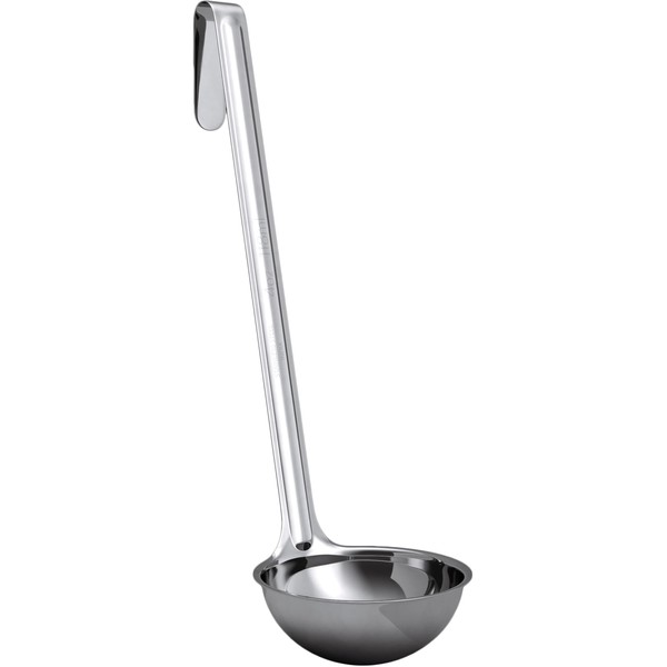 One (1) 4-ounce, stainless-steel ladle, measuring 14 1/2 inches. It is dishwasher safe and has a long, hooked handle for easy storage. Use it to perfectly portion soup, broth, gravy, or salad dressing.