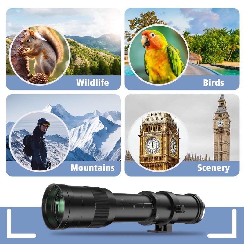 - 【Manual Focus Zoom Lens】This is a manual focus lens with no electronic contacts. It needs the user to rotate the focus ring (located at the front of the lens) manually to achieve sharp focus. By meticulously adjusting focus, aperture, shutter speed, and ISO, you gain absolute command over every shot. The manual telephoto lens only works in manual focus mode.