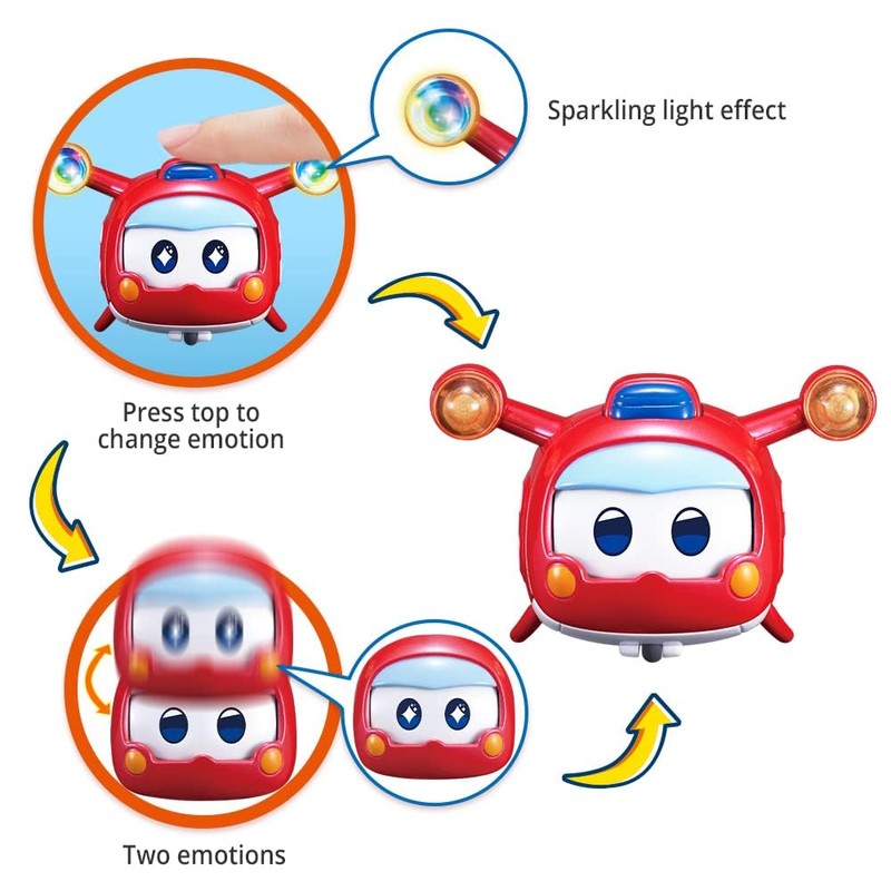 - Super mini jet: the transforming figure is accompanied by its Super Mini (or Super Pets) in the animation series, its eyes change and the engines light up as soon as you press on the top; like the transforming figure, it is equipped with freewheels for an even greater gaming experience.