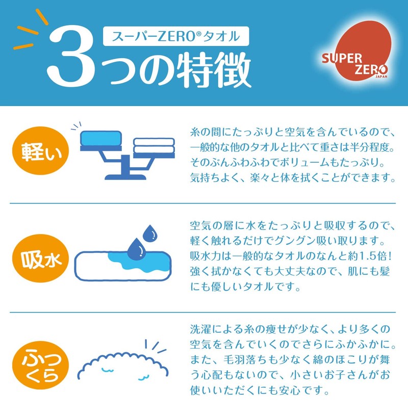- (Towels made with Super Zero) Super Zero is a special twisted yarn developed by Asano Twisted Yarn. A revolutionary formula using water-soluble threads creates space between fibers and contains a lot of air. This creates a towel that combines a fluffy volume and lightness